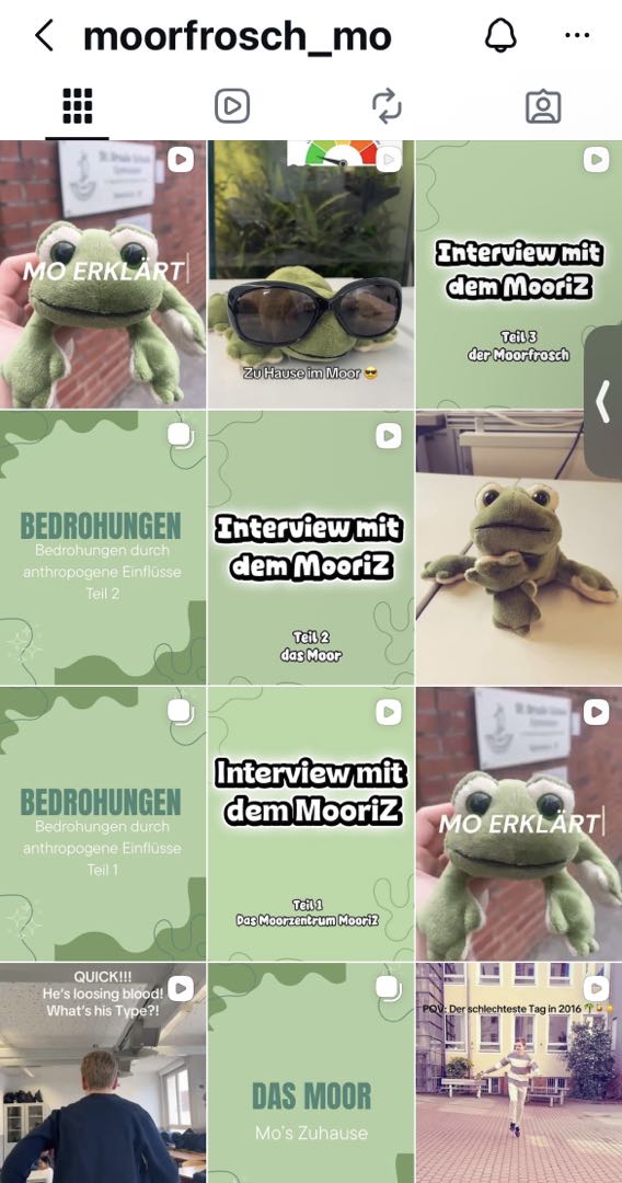 Mo der Moorfrosch erklärt mit aktuellen Trends aber auch wichtigen Informationen die Bedrohung seiner Art durch die menschengemachte Veränderung der Moore. Der Beitrag soll beim ZAP Artenschutz Wettbewerb des Zoo Hannover eingereicht werden. das Ziel sind 500 Follower.