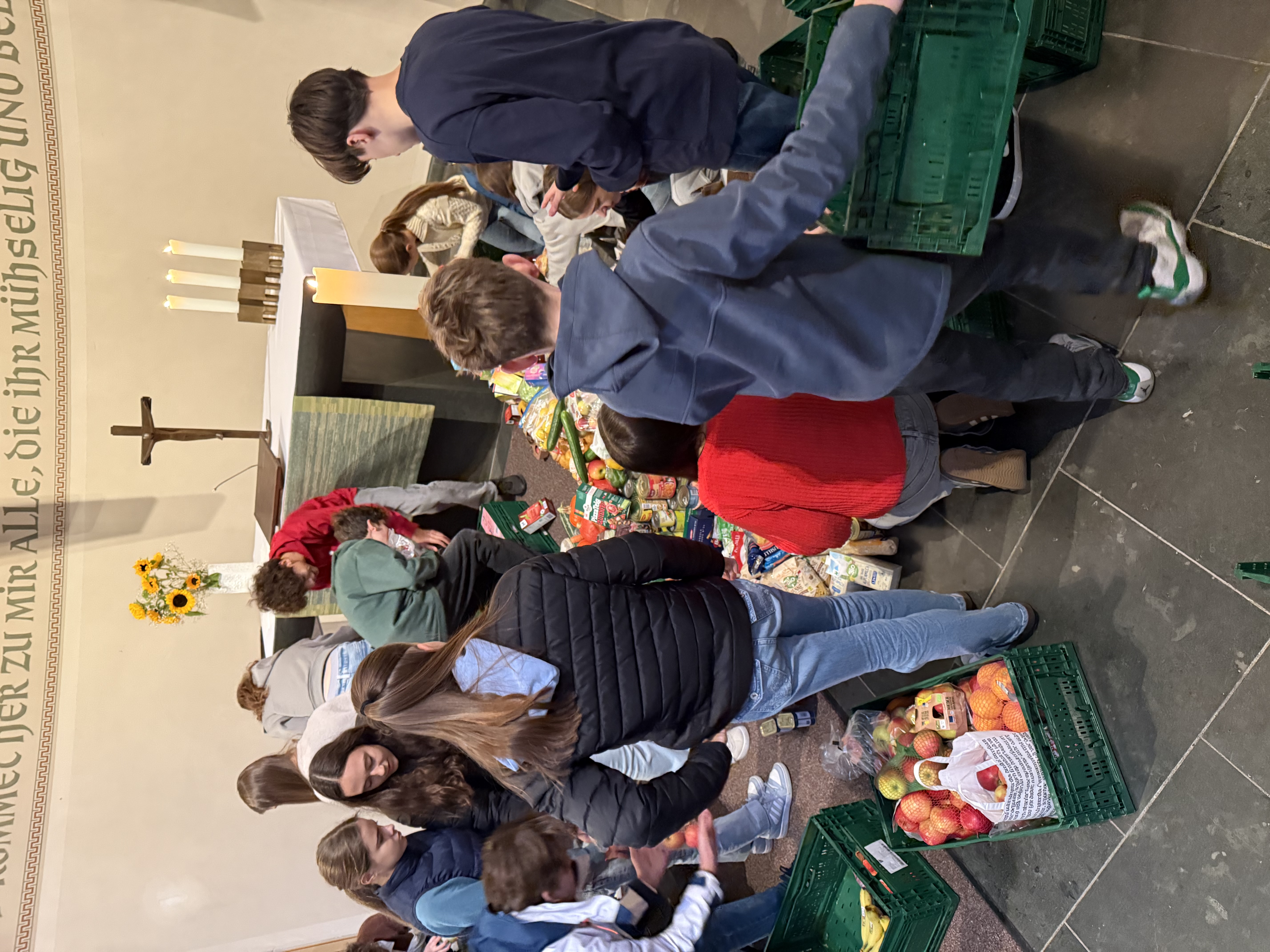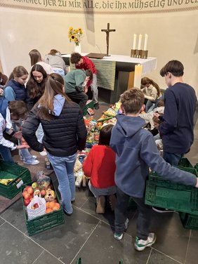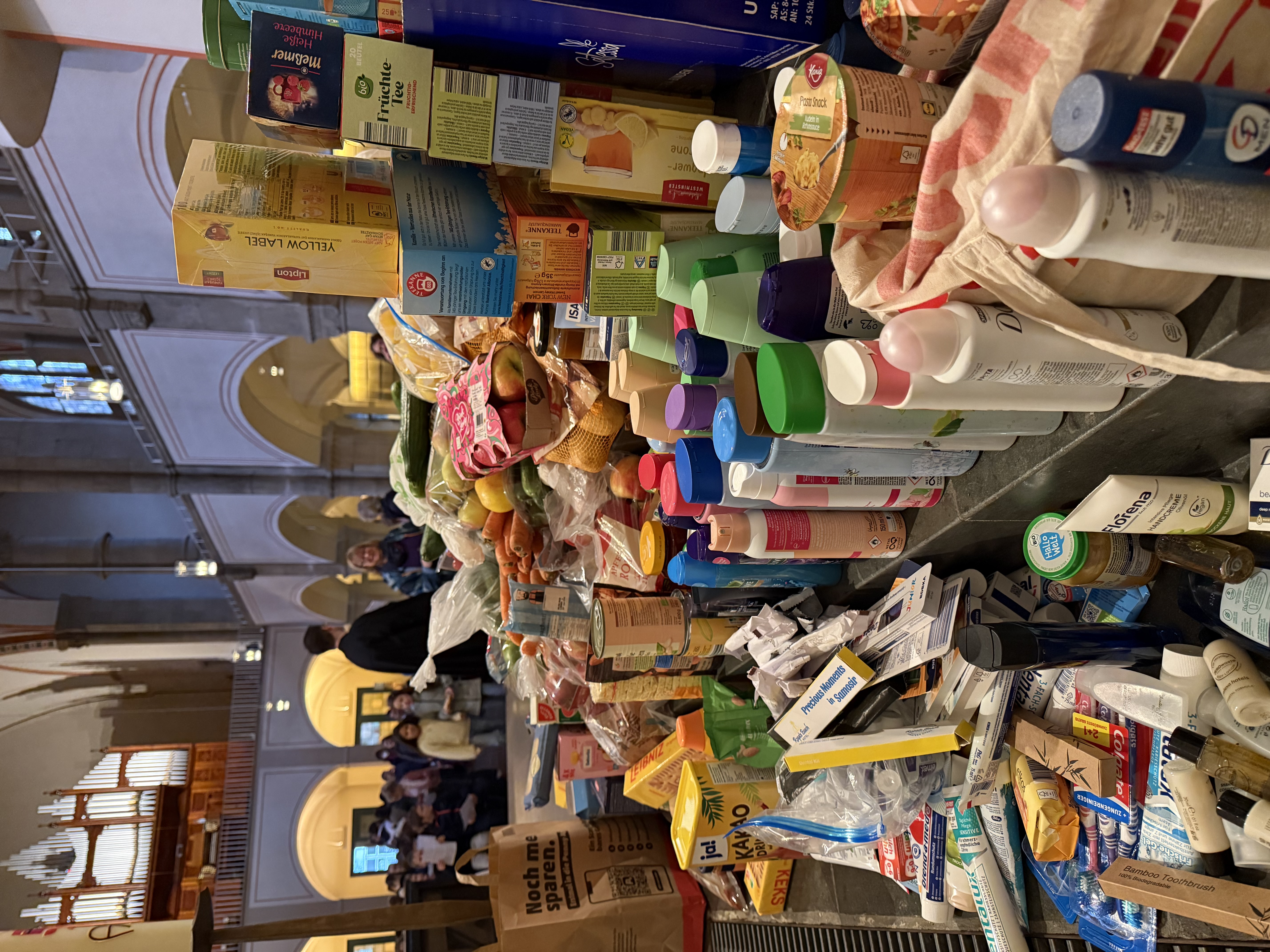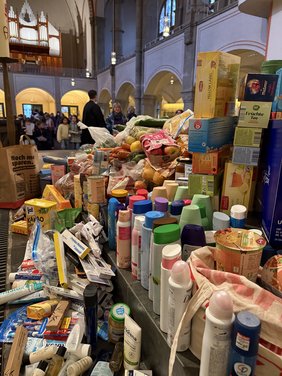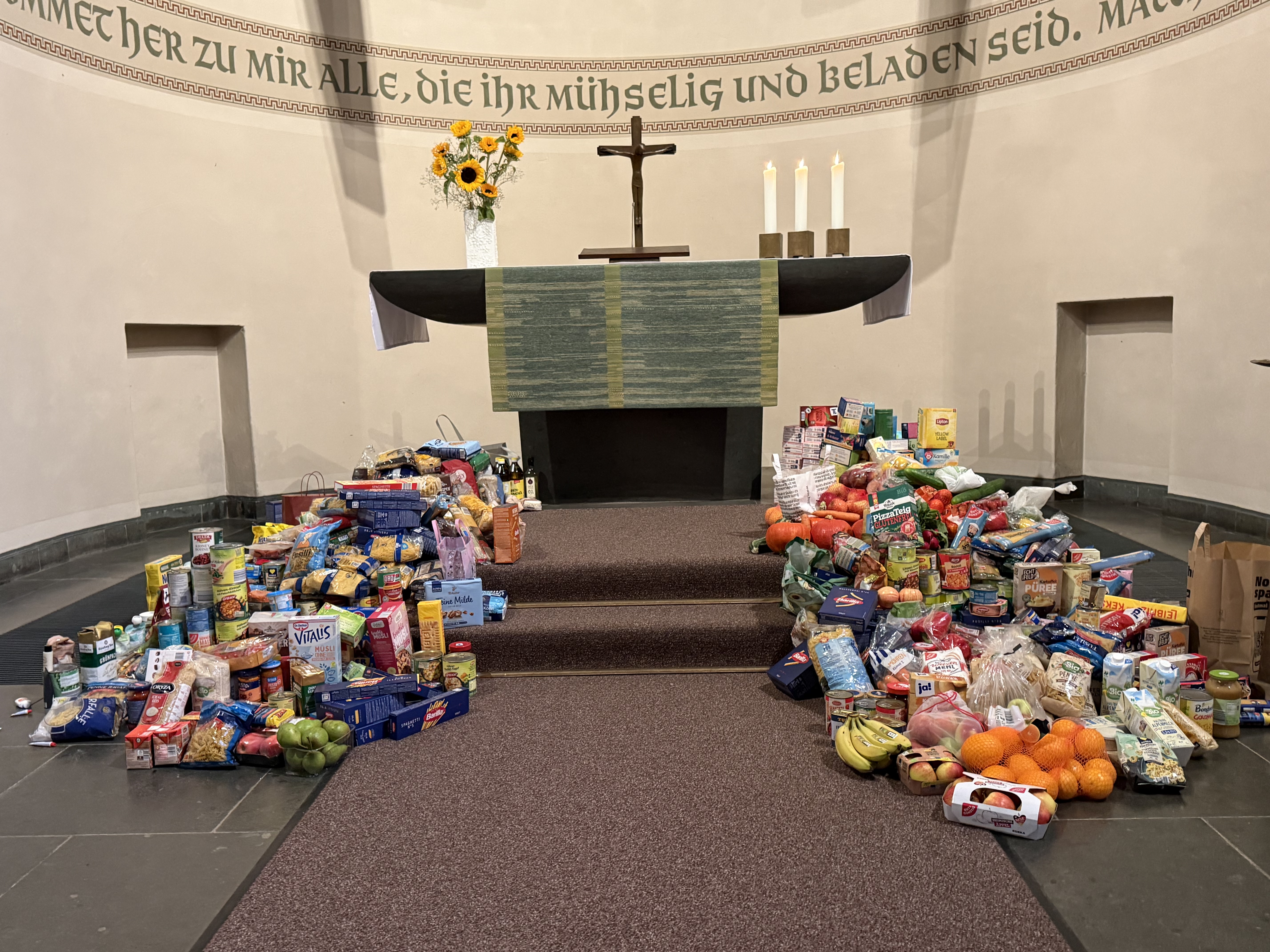 Zusammen kam am Ende ein Berg an Obst, Gemüse, Nudeln aber auch Duschgel, Taschentücher und weitere Lebensnotwendige Artikeln, die sich im Altarraum stapelten.