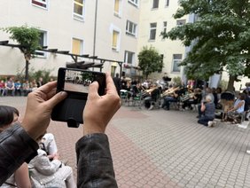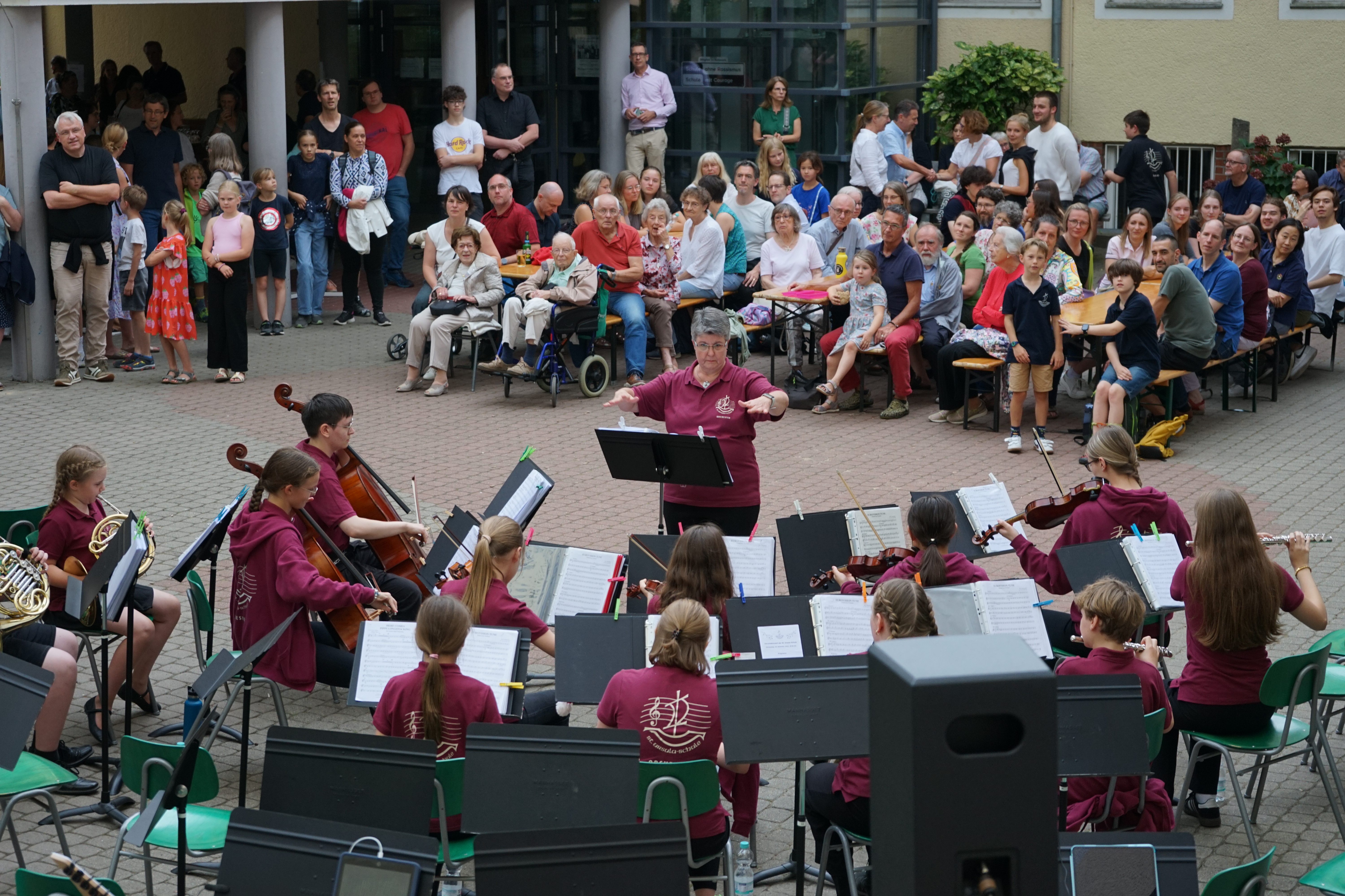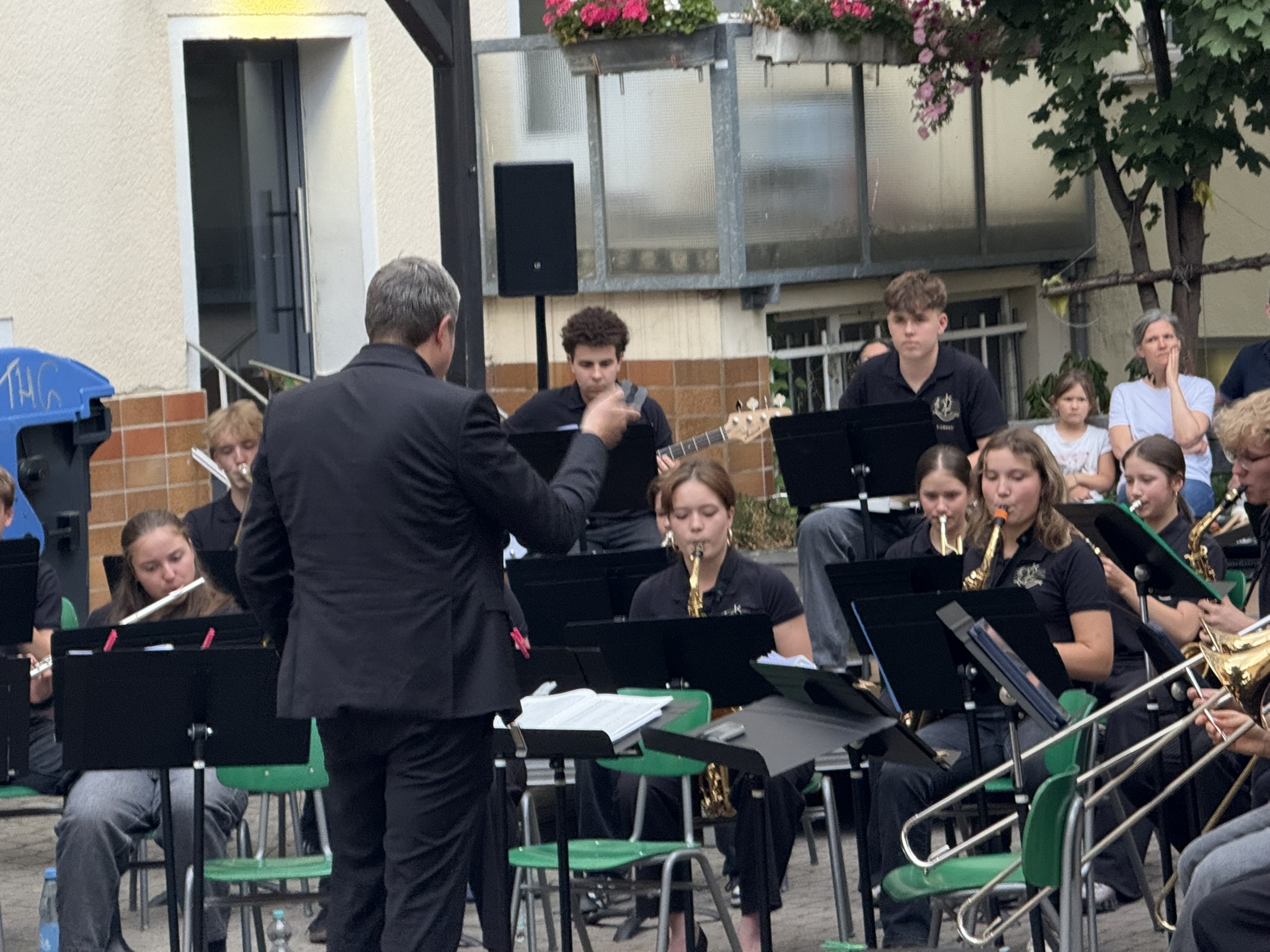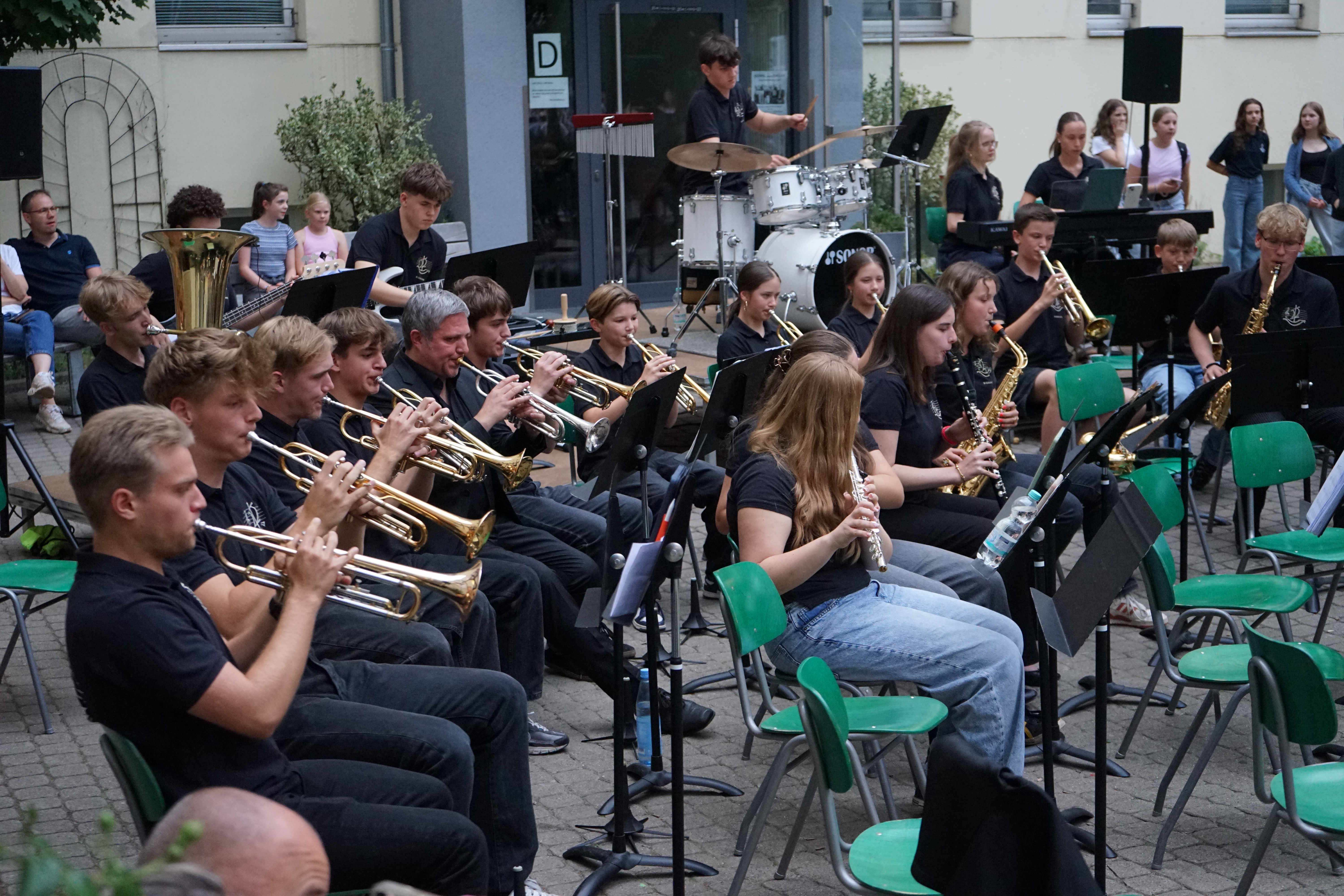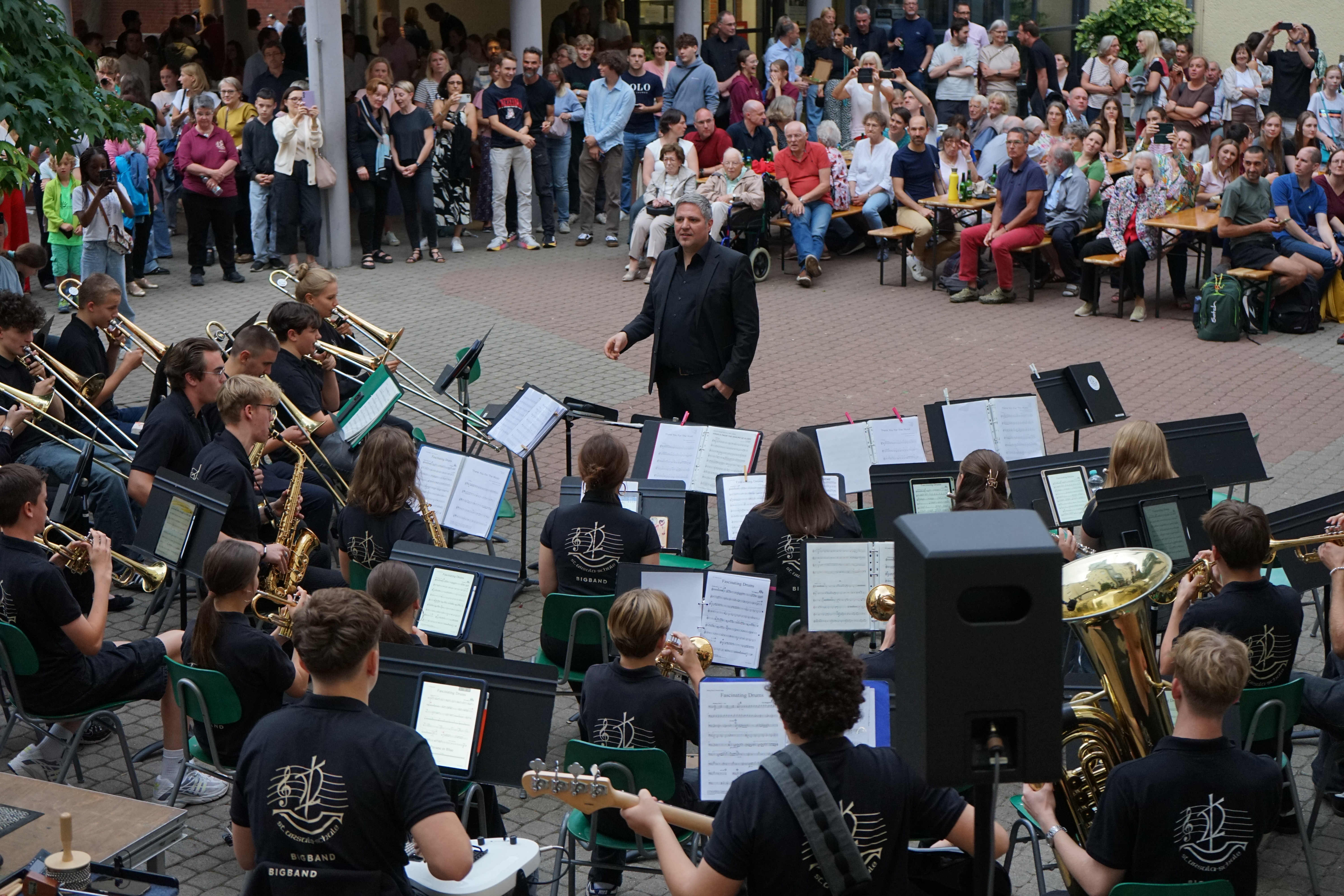 Am Schluss trat das Orchester wie gewohnt noch einmal zusammen mit der Big Band auf. Das Publikum auf dem gut gefüllten Schulhof quittierte die hervorragenden Darbietungen mit großem Beifall und freut sich schon auf das nächste Konzert.