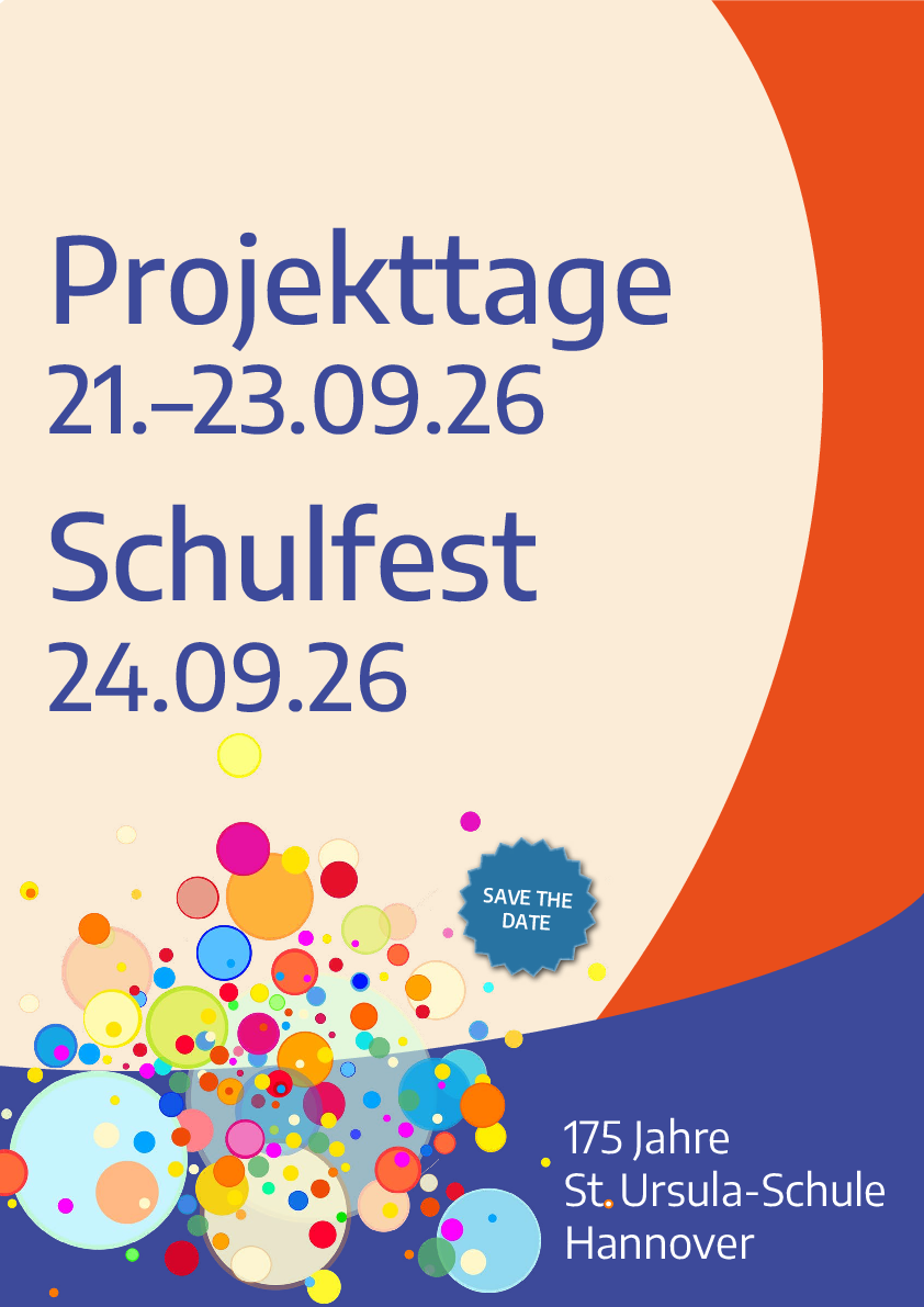 Zum 175. Schuljubiläum finden vom 21.–23.September 2026 Projekttage unter dem Motto „DU – ICH – WIR“ statt. Gemeinschaft, Zusammenarbeit und individuelle Stärken stehen dabei im Mittelpunkt. Schülerinnen, Schüler und Eltern sind herzlich eingeladen, eigene Projekte einzubringen. Bitte das über schulcloud verteilte Formular am Computer ausfüllen und bis zum 15.05.2026 via schulcloud bei Sonja Schüttlöffel einreichen. Wir freuen uns auf viele kreative Ideen und inspirierende gemeinsame Projekttage, die wir am 24. September mit einem Schulfest gemeinsam feiern wollen!