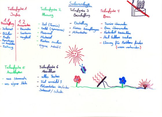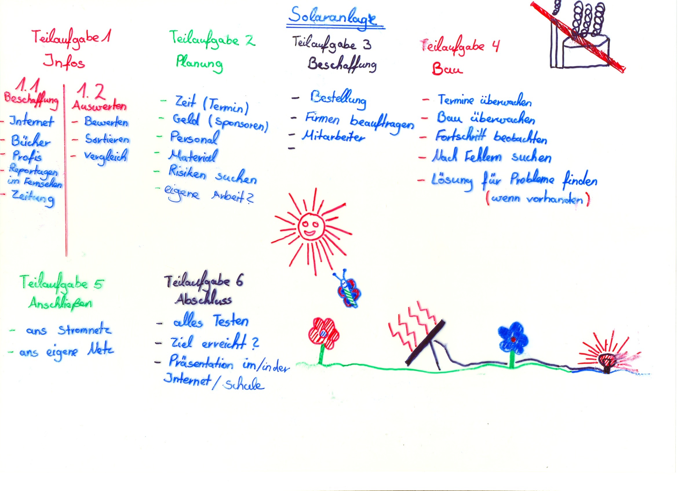 Uns wurde erklärt, dass wir zuerst ein Projektstrukturplan (s.o.) anfertigen müssen, was eine Art Zeitplan ist und wird dazu genutzt, dass man nicht in Zeitdruck gerät. Außerdem ist dieser Plan dafür gut, dass wir Risiken im Voraus umgehen können, und dass wir sehen was wir schon gemacht haben, wo wir gerade sind und was wir noch machen müssen. Herr Berendes hat uns auch noch ein Pfeilschaubild gezeigt, wo die einzelnen Projektphasen deutlich werden: